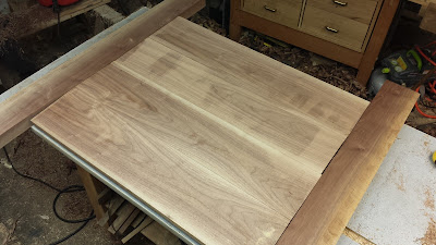 Here's the results of the resawing. You'll notice that the two boards at the bottom of the picture are a nice book match but the others are two different boards. And you can clearly see that one of the breadboard ends is another board again. The way I tried to work it out is a border of darker boards with the center field being lighter stuff. You can see it in the following picture.