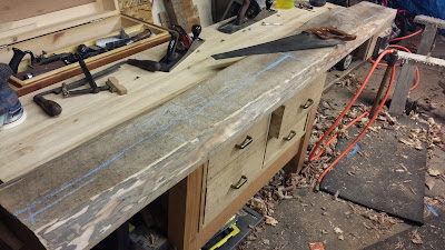 After squaring up the panel I cut the joinery for the breadboard ends and install the 4 boards around the outside and a clean up with my trusty old jack plane. This one dates from the 1880's.