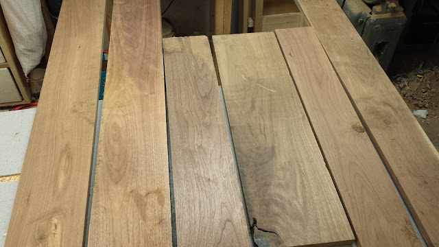 variation of colors in walnut can vary wildly from tree to tree. Here we see 5 boards and at least 3 different